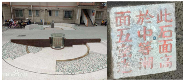 后广东陆军测量局将其高程引测至广州大东门北横街两广陆军测绘学堂(1911 年后改为广东陆军测量学校),在学堂内埋设花岗岩标石,使标石面高程恰为高出中等潮位 5 米,并刻上“此石面高于中等潮位五密达”(注:密达为英文 meter 中文音)字样,称之为“珠江高程系水准原点”,该点高程作为广州市高程系起算一直沿用至今。