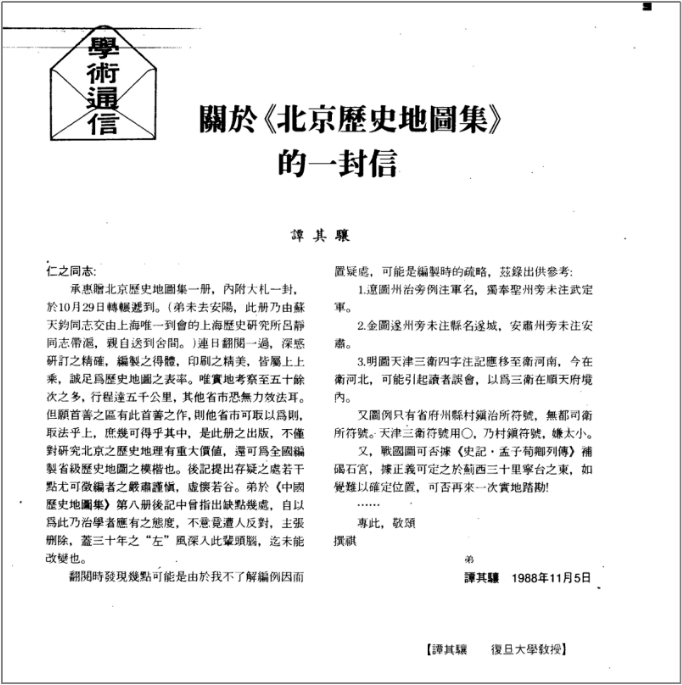 谭其骧院士写信给侯仁之院士:“图集研订之精确,编制之得体,印刷之精美,皆属上上乘,诚足为历史地图之表率……”