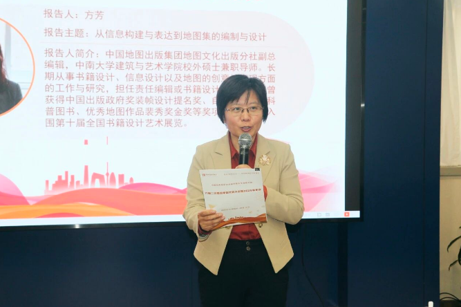 中国地图出版集团地图文化出版分社副总编辑、副编审方芳做了《从信息构建与表达到地图集的编制与设计》的报告。作为长期深耕地图信息设计与文化出版领域的资深专家,方芳结合多部获奖作品案例,深入剖析了信息梳理、结构化组织与 “画像” 构建对地图视觉表达的基础性作用。报告指出,当地图汇聚成地图集,信息构建将升级为时空叙事,需通过系统性视觉设计化解复杂信息呈现难题,为智能制图时代坚守 “信息先于视觉” 的编制理念提供了宝贵实践经验。