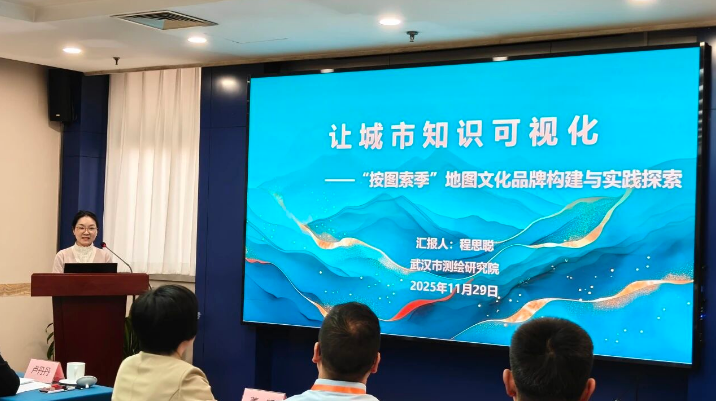 武汉市测绘研究院地图编研中心主任工程师、高级工程师程思聪做了《让城市知识可视化 ——“按图索季” 地图文化品牌构建及实践探索》的报告。报告以荣获 “星湖杯” 地图设计大赛特等奖的 “按图索季” 桌游为核心案例,阐述了以测绘地理信息数据为基础、“让城市知识可视化” 为核心理念的品牌构建路径。该品牌形成了 “1+N” 地图服务模式,既搭建了社会公众与测绘专业的沟通纽带,又成为传承城市文化、推动地图创新发展的重要载体,为传统地图焕发新时代活力提供了生动范例。