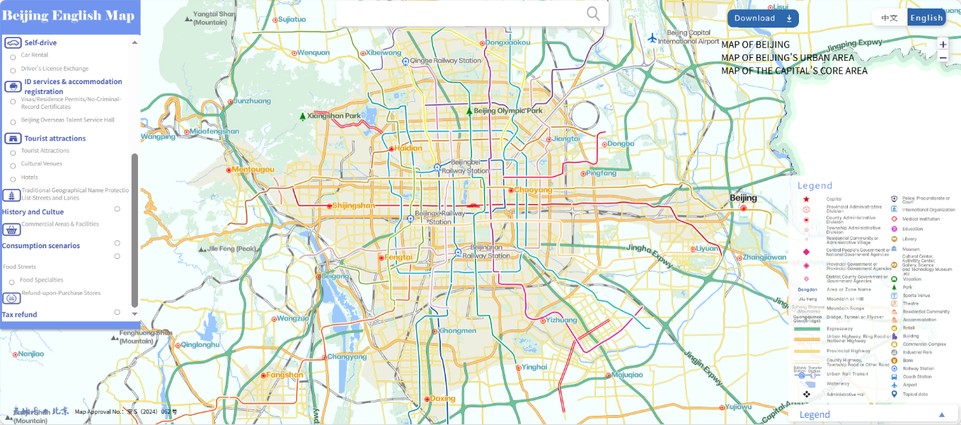 为助力北京国际交往中心建设,优化外籍人士在京出行服务,提升对外交流服务水平,市规划自然资源委、市政务和数据局、市委外办市政府外办、市教委组织编制了北京市英文地图(2025版)。地图内容更新至2025年底,与2024版相比,应用场景更加多元,内容信息更加丰富,历史文化特色更加鲜明。