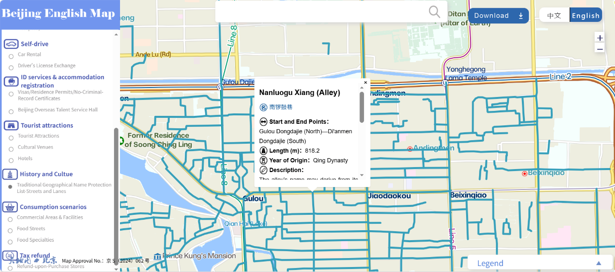 历史文化:标注了传统地名保护名录1111条街巷胡同,可查询年代、得名原因等信息。