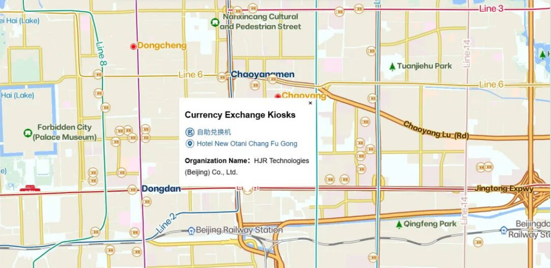 外币兑换:包含89台外币自助兑换机,主要分布在城六区及两大国际机场,为来京外籍人士提供美元、英镑、日元、港币、欧元、澳大利亚元、加拿大元等十余种主流外币现钞结汇等业务,满足其在京现金支付需求。